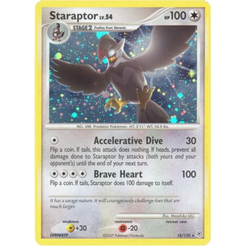 Card TypePokmon FormStage 2 – Evolves from Staravia Type Hit Points100 HP Accelerative Dive (30) Flip a coin. If tails, this attack does nothing. If heads, prevent all damage done to Staraptor by attacks (both yours and your opponent’s) until the end of your next turn.Brave Heart (100) Flip a coin. If tails, Staraptor does 100 damage to itself. Weakness: +30 Resistance: -20