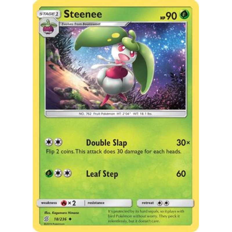 Card TypePokmon FormStage 1 – Evolves from Bounsweet Type Hit Points90 HP Double Slap (30) Flip 2 coins. This attack does 30 damage for each heads.Leaf Step (60) Weakness: 2Resistance: NoneRetreat Cost:
