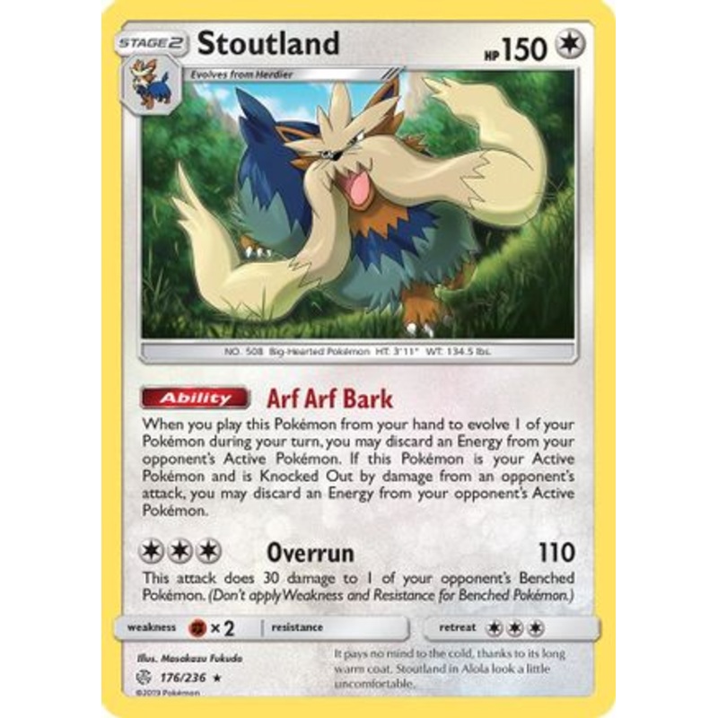 Card TypePokmon FormStage 2 – Evolves from Herdier Type Hit Points150 HP AbilityArf Arf Bark When you play this Pokmon from your hand to evolve 1 of your Pokmon during your turn, you may discard an Energy from your opponent’s Active Pokmon. If this Pokmon is your Active Pokmon and is Knocked Out by damage from an opponent’s attack, you may discard an Energy from your opponent’s Active Pokmon. Overrun (110) This attack does 30 damage to 1 of your opponent’s Benched Pokmon. (Don’t apply Weakness and Resistance for Benched Pokmon.) Weakness: 2 Resistance: None Retreat Cost: